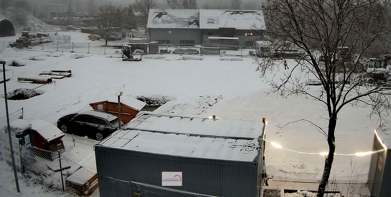 01.12.2025: Der Winter hatte Zwönitz fest im Griff. Die Baustelle präsentierte sich kurz im winterlichen Weiß — und jetzt geht es weiter.