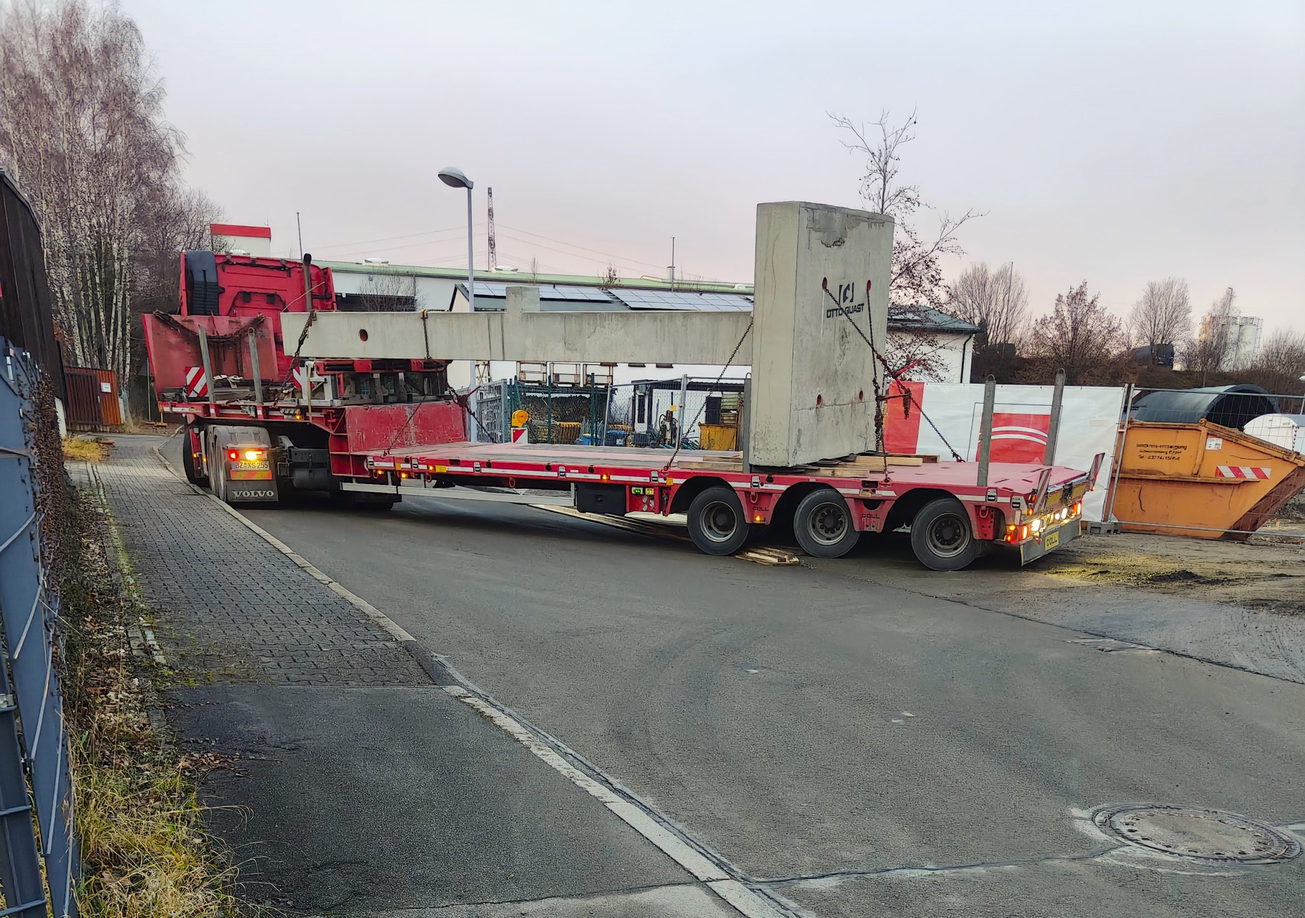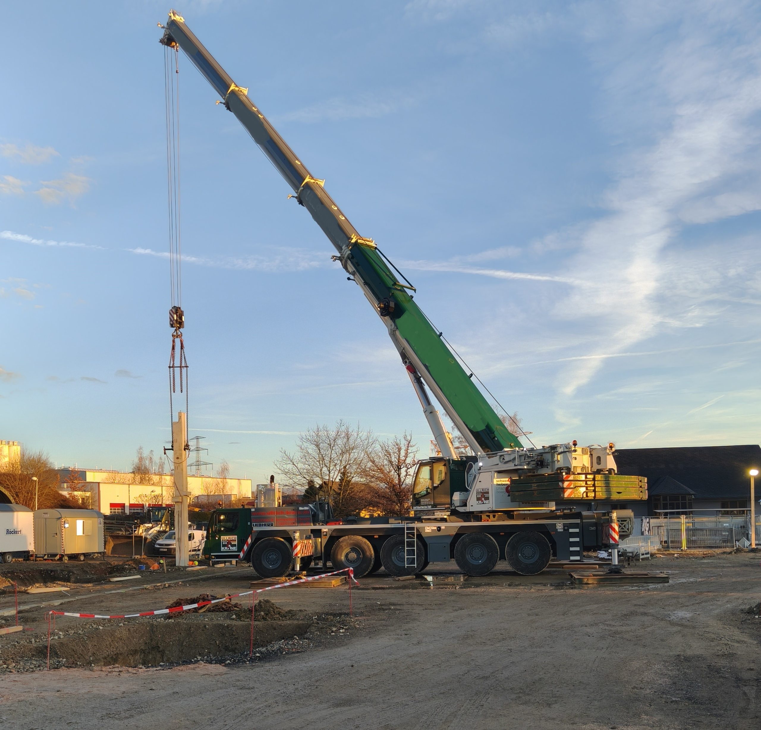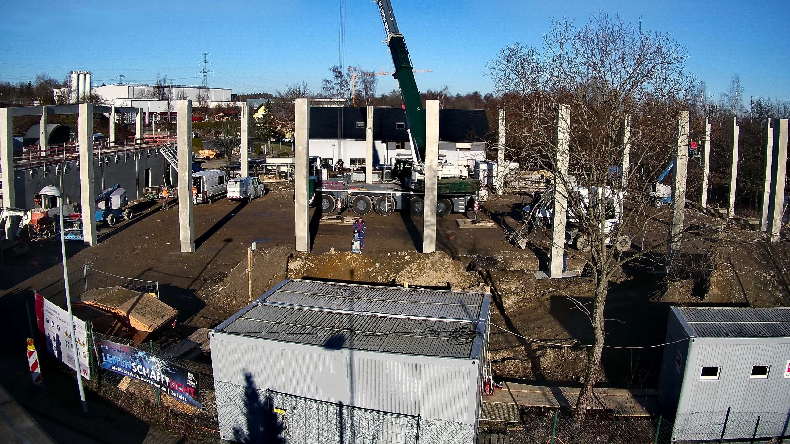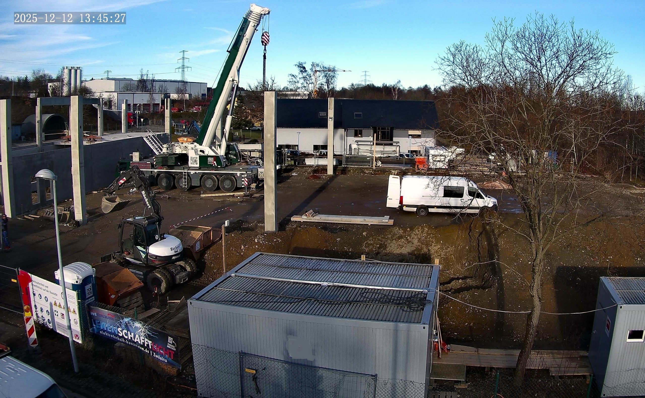 19.12.2025: In den letzten Tagen sind viele LKWs mit den vorbereiteten Betonstützen und ‑wänden angerollt. Die Stützen stehen und auch ein Teil des künftigen Bürokomplexes ist bereits zu erkennen.